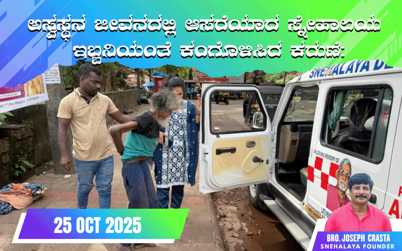 ಮಂಜೇಶ್ವರ, ಅಕ್ಟೋಬರ್ 25, 2025: ದಿನಾಂಕ 23 ಅಕ್ಟೋಬರ್ ರಂದು ಮಂಗಳೂರಿನ ಸೆಂಟ್ರಲ್ ರೈಲ್ವೆ ನಿಲ್ದಾಣದ ಸಮೀಪದ ರಸ್ತೆಯಲ್ಲಿ ಅಸ್ವಸ್ಥ ಸ್ಥಿತಿಯಲ್ಲಿ ಮಲಗಿದ್ದ ವ್ಯಕ್ತಿ ಶ್ರೀ ಸುಕುಮಾರ್ ಅವರನ್ನು ಸ್ನೇಹಾಲಯ ರಕ್ಷಣಾ ತಂಡವು ಮಾನವೀಯ ಮನೋಭಾವದಿಂದ ಸುರಕ್ಷಿತವಾಗಿ ರಕ್ಷಿಸಿದೆ.